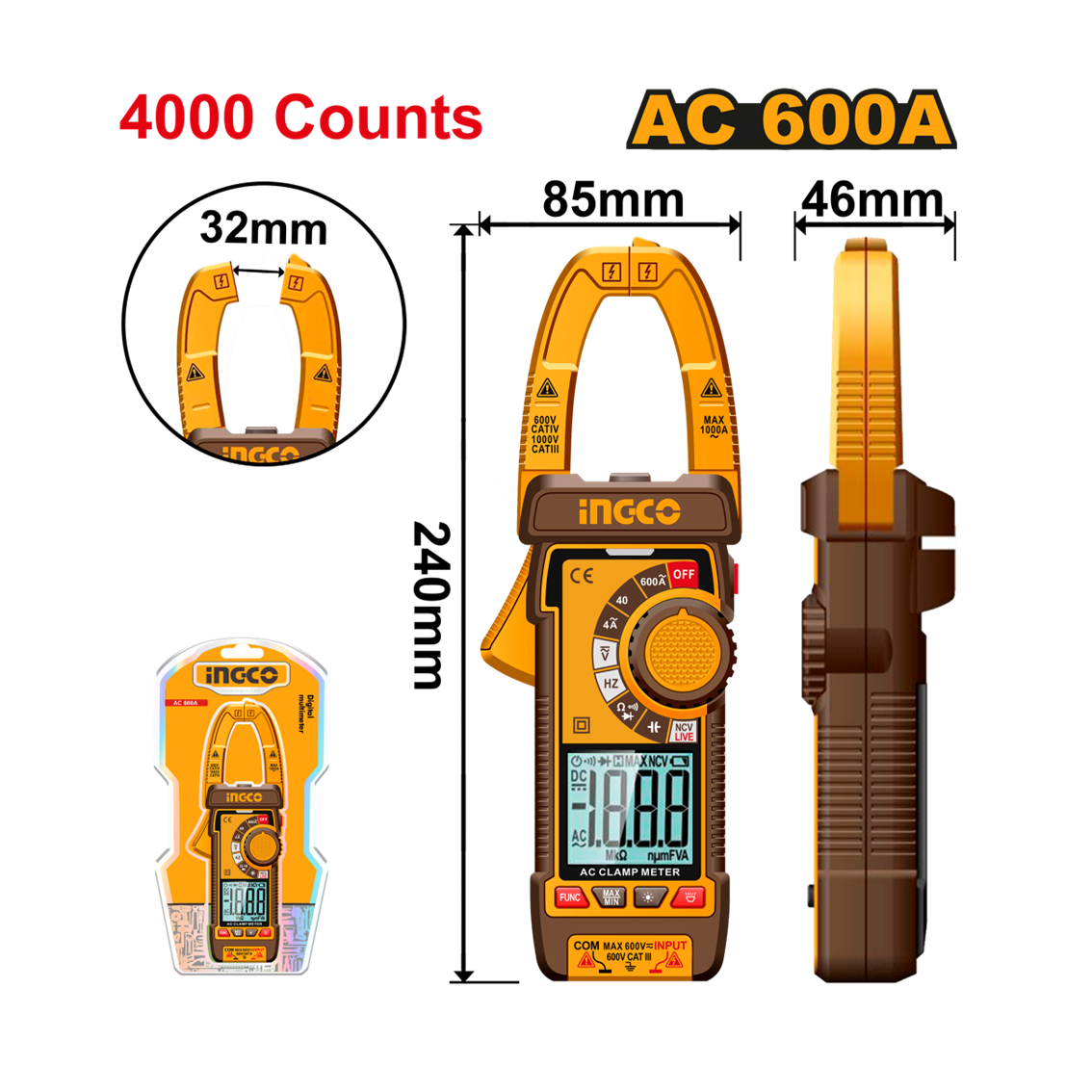 ALICATE AMPERÍMETRO DIGITAL 600A INGCO DCM66001″