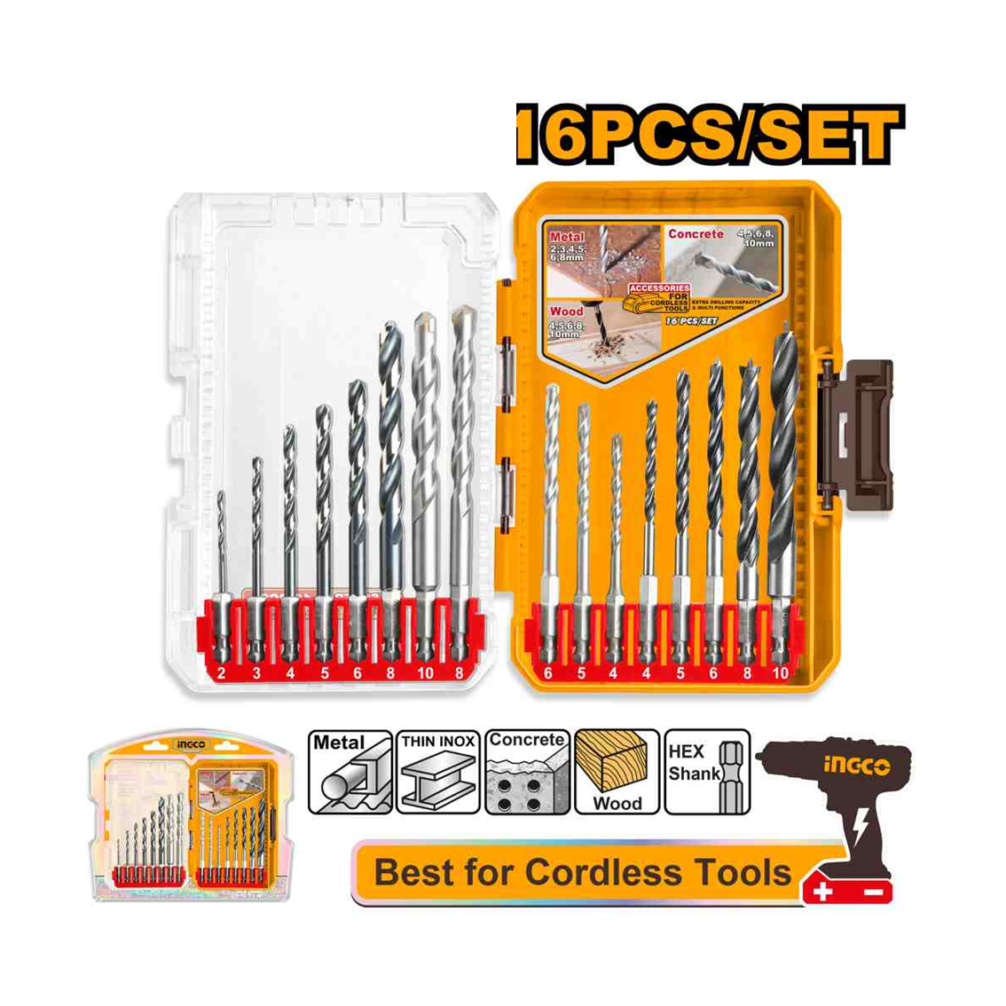 JOGO DE BROCAS C/16PC HASTE HEXAGONAL INGCO AKDL11608