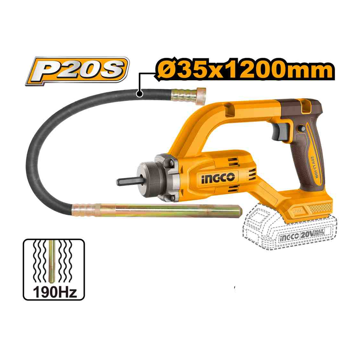/ VIBRADOR DE CONCRETO COM MANGOTE 35X1200MM À BATERIA 20V INGCO (NAO ACOMPANHA BATERIA) CCVLI202502